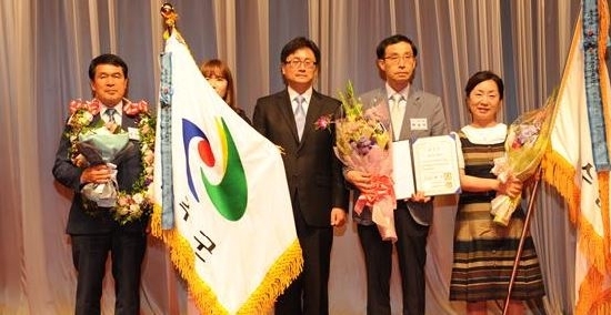 ▲ 박성일 완주군수(왼쪽)가 1일 부산 롯데호텔에서 열린 2015년도 드림스타트사업 보고대회에서 국무총리 기관상을 수상하고 기념촬영하고 있다. 사진 제공=완주군