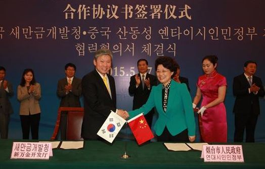 새만금개발청(청장 이병국)은 한중 FTA 정식서명(6월 1일)을 앞두고 지난달 27일 중국 산동성 옌타이시(시장 장용샤 <張永霞> )와 경제교류 및 협력을 위한 상호협력 협의서(MOU)를 체결했다고 밝혔다. 張永霞>