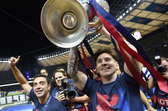 ▲ 리오넬 메시가 6일에 베를린 올림픽 경기장에서 유벤투스와 FC 바르셀로나의 UEFA 챔피언스 리그 결승 축구 경기 후 트로피를 들고 기념촬영을 하고 있다. 연합뉴스