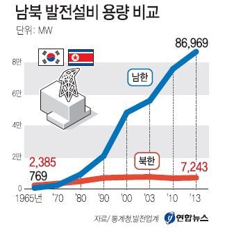 10년 전인 2003년 남한과 북한의 전력설비 총 용량은 각각 5만653MW와 7772MW로 7배 차이가 났다. 그러나 이후 10년 간 남한의 발전설비 용량은 55%(3만9016MW) 증가했지만 북한은 오히려 역성장(-529MW)하면서 격차가 사상 최대로 벌어졌다. 첫 조사 시점인 1965년에만 해도 남한의 전력생산 능력은 769MW에 불과해 북한(2385MW)의 3분의 1에 불과했다. 북한의 우위는 1970년대까지 계속됐다. 뉴스