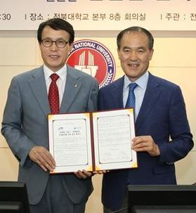 ▲ 이남호 전북대 총장(왼쪽)과 이항로 진안군수가 상생발전 협약을 체결하고 협약서를 들어보이고 있다.