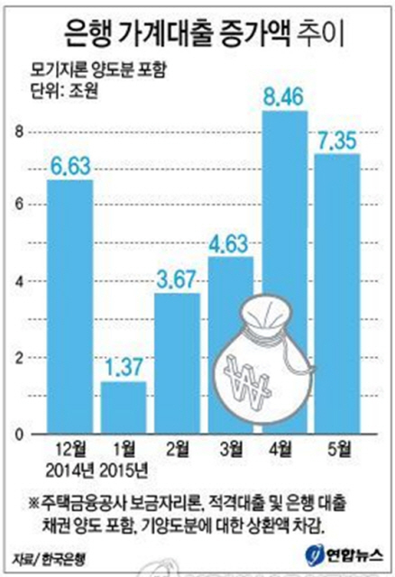 전달 증가폭은 2008년 이후 월간 은행의 가계대출 증가액으로 최대였던 4월(8조5000억원)보다 작았지만 예년과 비교하면 여전히 급격한 증가세를 유지했다.