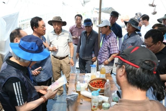 ▲ 10일 지방행정연수원에서 교육을 받고 있는 은퇴를 앞둔 공무원들이 방울 토마토 재배로 고수익을 올리고 있는 완주 고산면 이종천씨 농장을 찾아 귀농귀촌에 대한 조언을 듣고 있다. 사진 제공=완주군