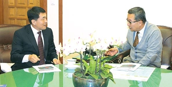 ▲ 박성일 군수(왼쪽)가 지난해 이재영 LH공사 사장을 만난 자리에서‘완주 삼봉지구 주택단지 조성사업’을 빨리 추진해달라고 건의하고 있다.