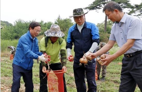 군청 공무원 60여명과 35사단 장병 300여명은 토요일인 13일 일손이 절대 부족한 관내 읍·면 지역 농가를 대상으로 양파와 블루베리, 과실솎기 등 자원봉사를 펼쳤다.