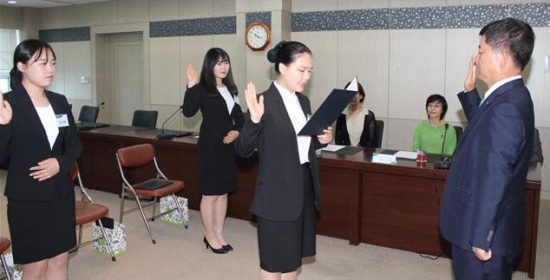 ▲ 15일 NH농협은행 전북본부가 특성화고 채용으로 입사한 직원 3명에게 마련한‘은사와 함께하는 임용장 교부식’에서 신규 직원들이 선서를 하고 있다.
