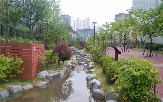 전북혁신도시 보행자 전용도로에 설치된 실개천이 15일 본격 가동됐다.