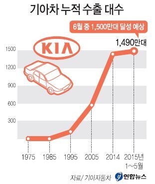 기아차의 수출 역사는 1975년 소형 트럭인 ‘브리사 픽업’ 10대를 카타르에 수출한 데서부터 시작된다. 이후 2005년에 500만대에 이어 2011년 3월 1000만대를 넘어섰으며 다시 4년3개월 만에 1500만대 고지에 올랐다. 기아차는 연간 25만대 수출 실적을 기록한 1998년부터 연간 수출 실적이 내수 판매를 넘어섰으며 2011년부터는 매년 100만대 이상 수출하고 있다. 연합뉴스