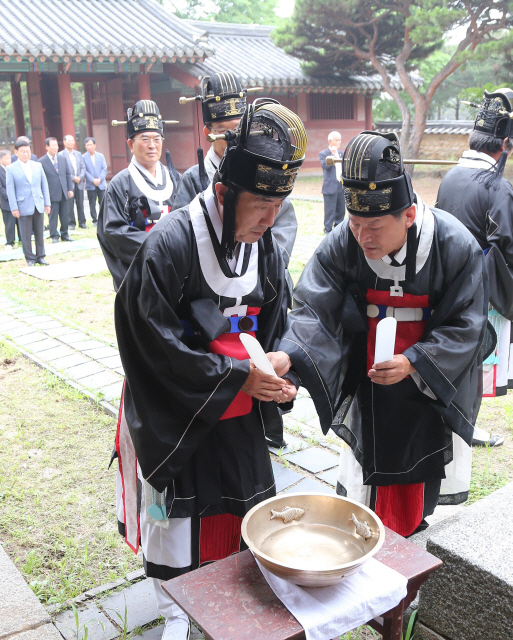16일 전주 한옥마을 경기전 조경묘에서 전주이씨 종친들이 의복을 차려입고 음력 초하루에 초헌관이 세 번 향을 피우는 분향례를 하고 있다.