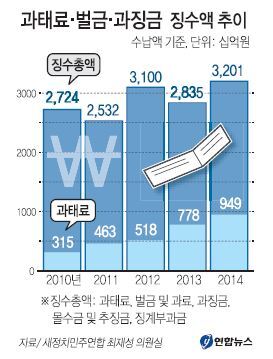 17일 기획재정부가 새정치민주연합 최재성 의원에게 제출한 자료에 따르면 정부는 지난해 벌금, 과태료, 과징금 등으로 모두 3조 2013억원(수납액 기준)을 거뒀다.