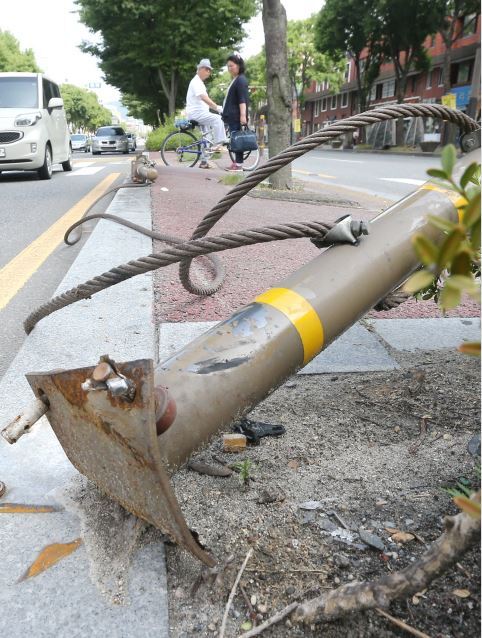 18일 전주 기린로 전자상가 앞 횡단보도에 무단횡단 방지 안전봉이 파손되어 지나는 시민 및 차량의 통행을 방해하고 있다.