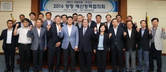 무주군 국가예산확보와 군정현안해결을 위해 지역구 국회의원과 군정 책임자인 군수가 머리를 맞대고 함께 고민했다. 23일 무주군청 대회의실에서는 국회 박민수 의원과 황정수 군수를 비롯한 간부공무원 등 30여명이 참석한 가운데 2016년도 국가예산 확보 및 군정 주요현안 해결을 위한 당정 예산정책협의회가 개최됐다.