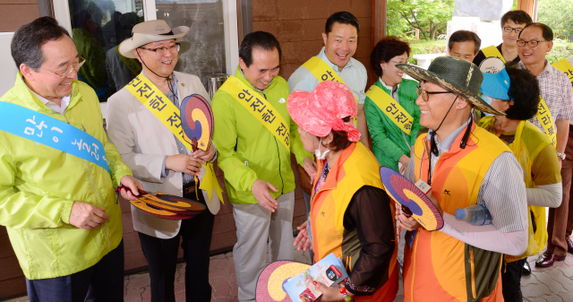 ▲ 23일 송하진 도지사와 정재근 행정자치부 차관, 황숙주 순창군수가 순창군 강천사를 찾아 메르스로부터 큰 타격을 받고 있는 도내 시장 활성화와 관광 분위기를 이끌어내기 위해 관광객 맞이와 지역 농산품 시식과 구매 활동을 펼치고 있다. ·안봉주 기자