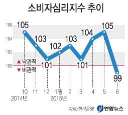 한국은행이 25일 발표한 ‘6월 소비자동향조사 결과’를 보면 이달 소비자심리지수(CCSI)는 99로 집계돼 전달보다 6포인트나 급락했다. 이달 CCSI는 2012년 12월 98을 기록한 이래 2년6개월 만에 가장 낮은 수준이다.
