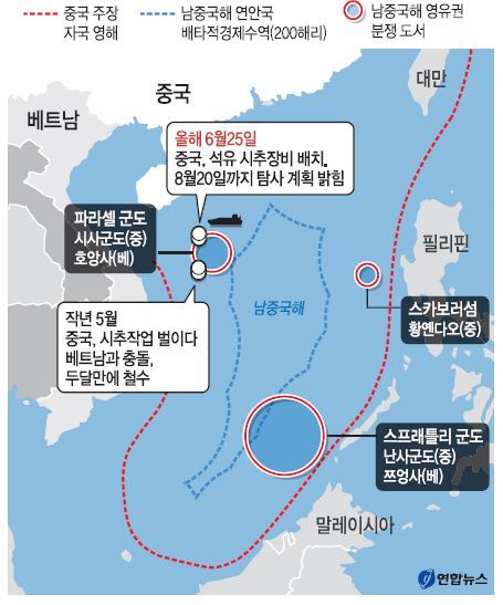 남중국해 영유권을 둘러싼 중국과 주변국의 대립각이 갈수록 커지고 있다. 중국은 남중국해에서 인공섬 건설, 베트남과 필리핀 어선의 조업 단속, 석유 시추작업 재개 등 영유권 강화 행보에 속도를 내고 있다. 연합뉴스