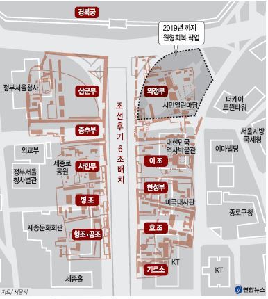 현재 광화문 시민열린마당 자리에 있었던 의정부는 1400년 정종이 처음 설치한 이후 영의정과 좌·우의정 등이 국왕을 보좌하며 6조의 업무 등 국가정사를 총괄하던 곳이었다. 연합뉴스
