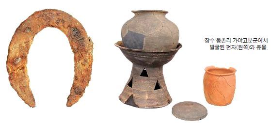 1일 장수군에 따르면 백두대간의 서쪽에 자리한 장수읍 동촌리 지역의 고분군 80여기 가운데 지름 16m 안팎의 중대형 봉분 1기에서 말뼈와 함께 징(釘)이 박힌 편자 1점이 나왔다. 봉분 내에는 주석곽(主石槨, 돌널무덤) 1기와 순장곽(殉葬槨) 2기가 배치됐으며, 이 주석곽에서 편자를 비롯해 단경호(短頸壺, 목 짧은 항아리), 기대(器臺, 그릇 받침), 발(鉢, 바리), 개(蓋, 뚜껑) 등의 토기류가 함께 발견됐다.