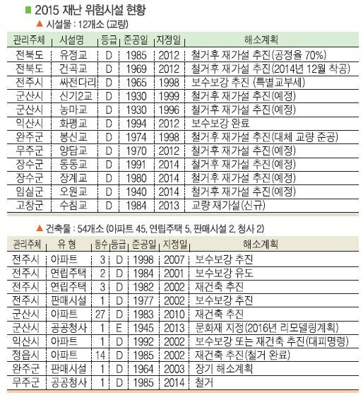 전북도 관계자는 “관리주체별로 각 지역의 재난위험시설을 정기적으로 육안검사하고 있으며 재원 마련 등을 통해 보수보강 및 재건축, 재가설을 추진하거나 추진할 계획이다”고 말했다.