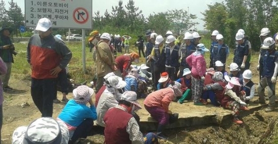 지난 5월 12일 새벽, 한전은 군산시 산북동을 비롯한 옥구읍 일대 5개 현장에서 3년간 중단됐던 새만금 송전탑 공사를 재개했다. 새만금송전철탑반대 공동대책위원회는 공사를 시작하면 통보하겠다는 약속을 깨고 농번기, 그것도 주민들의 눈을 피해 새벽 2~3시부터 공사를 강행한 한전에 격렬하게 반발했다. 부상자도 속출했다. 수확을 앞둔 보리밭이 망가지는 모습에 항의하던 농민의 트랙터가 뒤집히는 사고가 났다. 5명의 할머니들이 병원에 입원했다.