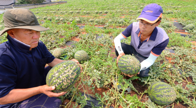멀리서 보니 수박껍질이 산탄(散彈)을 맞은 듯 희끗희끗하다. 잔설(殘雪)이 남아 있는 것 같기도 하다. 저 너머에서는 유진열씨(53) 부부가 농약치기 작업을 하고 있다. 묵묵히 일만 할뿐 별다른 말이 없다.