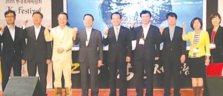 ▲ 서울 삼성동 코엑스(COEX)에서 열린 ‘K-Festival 2015 한국축제박람회’에서 이건식 김제시장(가운데) 등 참석자들이 파이팅을 외치며 기념촬영을 하고 있다.