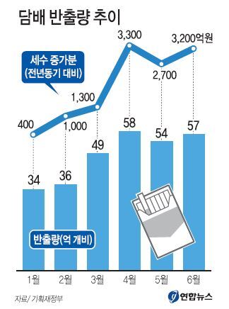 12일 기획재정부에 따르면 올해 상반기 담배 판매로 거둬들인 세금은 4조3700억원으로 작년 상반기(3조1600억원)보다 1조2100억원 증가했다.