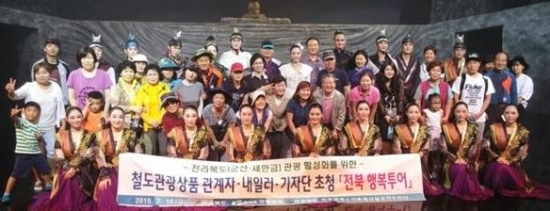 ▲ 전주세계소리축제조직위 상설공연추진단이 지난 7일부터 10일까지 실시한 ‘전북 행복투어’에 참가한 내일러와 기자단, 전북 철도상품 개발자들이 ‘아리울 스토리’ 공연을 관람한 후 기념촬영을 하고 있다.