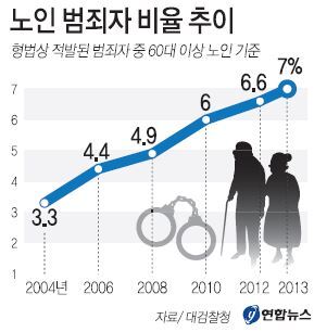 연도별 형법상 범죄자 가운데 60대 이상 비율은 2004년 3.3%, 2006년 4.4%, 2008년 4.9%, 2010년 6%, 2012년 6.6% 등 꾸준히 증가하고 있다.