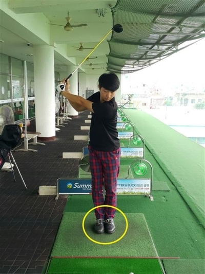 사진3은 스탠스를 바르게 취하고 하는 연습이다. 이때 머릿속에서 클럽의 헤드가 먼저 돌아가는 기분을 느끼며 스윙을 해본다. 클럽의 헤드가 먼저 돌아가는 느낌을 유지하고 볼을 쳐보면 볼의 구질이 달라지는 것을 확인할 수 있다.