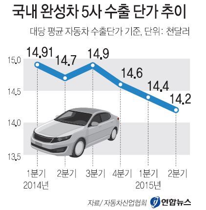 국내 완성차업체들의 평균 수출 단가가 3분기째 줄어 실적 악화에 큰 영향을 끼친 것으로 나타났다.