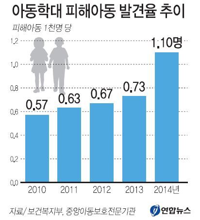 이는 2013년 0.73명보다 50.7%나 늘어난 것이다. 아동인구 1000명당 피해아동 발견율은 2010년 0.57명, 2011년 0.63명, 2012년 0.67명 등으로 그동안 1명을 넘지 않았었다. 다만, 아동학대 발생과 발견이 많은 편인 미국의 9.13명(2013년 기준)에 비해서는 적은 편이다. 연합뉴스
