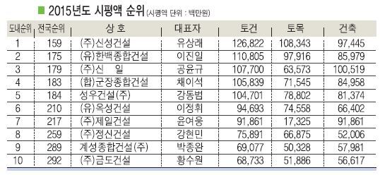 도내 소재 종합건설업체중 대표 업종인 토목건축공사업종을 등록한 업체의 2015년도 시공능력평가액은 (주)신성건설이 토건·토목·건축 합계 3326억1000만원을 기록하며 지난해에 이어 1위를 고수했고 그 뒤를 이어 (유)한백종합건설이 2947억원으로 지난해 3위에서 2위로 한단계 올라섰으며 지난해 10위권으로 신규 진입했던 (주)신일이 6단계 상승한 3위를 기록했다.