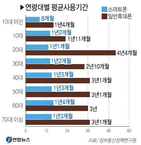 정보통신정책연구원(KISDI)은 5일 공개한 ‘휴대전화 평균사용기간 및 교체시기 분석’ 제하의 보고서에서 국내 소비자들의 휴대전화 단말기 평균 사용 기간이 1년7개월인 반면 스마트폰은 이보다 훨씬 짧은 1년2개월로 나타났다고 밝혔다.
