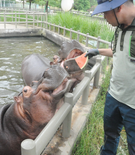 연일 폭염이 계속되는 가운데 5일 전주 동물원에서는 더위에 지친 하마에게 사육사가 시원한 수박을 나눠주고 있다.