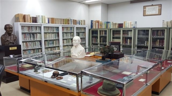 ▲ 동국대학교 중앙도서관 지하 2층에 마련된 미당문고. 이곳에서는 미당 사후 남현동 자택에 있던 그의 유품들을 보관하고 있다. 육필시집부터 소장도서, 일상용품, 흉상 등 다양한 유품이 전시돼있다.