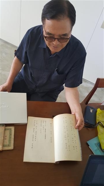 ▲ 김동수 미당문학회 회장이 지난 달 31일 전주시 중화산동 2가의 PIU 갤러리에서 서정주 시인에게 직접 받은 미당 육필시집을 선보이며, 서정주 시인과의 일화를 설명하고 있다.