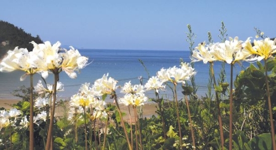 ▲ 부안 위도에서만 볼 수 있는 위도상사화가 해변을 배경으로 하얀 자태를 뽐내고 있다.