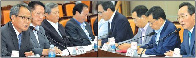 ▲ 국가예산 확보와 도정 주요현안을 논의하기 위한 새누리당 전북도당과 전북도의 정책협의회가 24일 전북도청 종합상활실에서 열린 가운데 송하진 도지사(맨 오른쪽)와 김항술 도당위원장(맨 왼쪽)이 국가예산 확보를 위한 협력방안에 대해 이야기를 나누고 있다. · 박형민 기자
