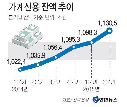 한국은행이 25일 발표한 ‘2015년 2분기 중 가계신용’ 통계를 보면 지난 6월 말 기준 가계신용 잔액은 1130조5000억원으로, 사상 처음으로 1130조원을 넘어섰다. 이는 한국은행이 가계신용 통계를 편제하기 시작한 2002년 4분기 이후 역대 최대 규모다. 지난 1분기 말 가계신용 잔액(1098조3000억원)과 비교해 32조2000억원(2.9%)이나늘어난 것이다. 2분기 동안 늘어난 액수는 1분기 증가액(13조원)의 2.5배에 육박하는 것으로, 역대 최대 규모에 해당하는 분기별 증가폭이다.