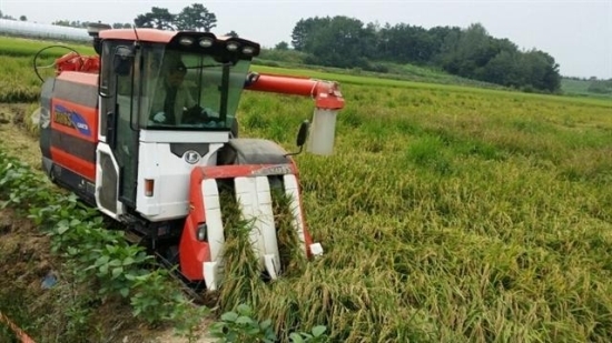 ▲ 김제시 성덕면 석동리 상리마을 최경국씨의 논에서 올 첫 벼 수확이 이뤄지고 있다.