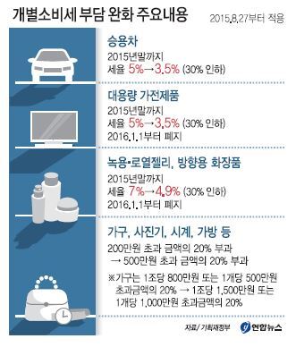 이번 대책 가운데 가장 눈에 띄는 부분은 승용차와 대용량 가전제품의 개별소비세를 연말까지 30% 인하한다는 점이다. 연합뉴스