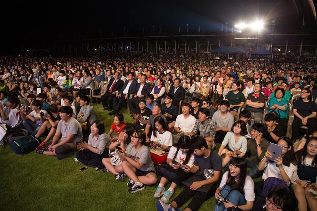 ▲ 제19회 무주반딧불축제 개막식이 지난 28일 무주읍 등나무 운동장에서 열린 가운데 참석자들이 웃고 있다.