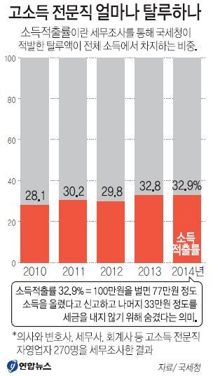 6일 국회 기획재정위 소속 새정치민주연합 오제세 의원이 국세청으로부터 제출받은 자료에 따르면, 지난해 의사와 변호사, 세무사, 회계사 등 고소득 전문직 자영업자 270명을 세무조사한 결과 소득적출률이 32.9%로 나타났다.