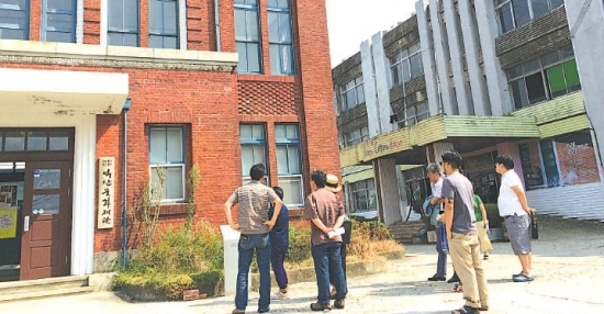 ▲ ‘봄 느린 기차’ 회원들이 익산 옥수리조합 건물을 찾아 익산지역의 근현대사를 공부하고 있다.