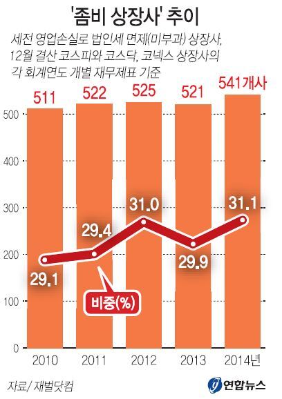 2010년의 511개사(29.1%)보다 30개사가 늘었다. 지난해 영업손실(적자)을 낸 상장사도 전체의 23.4%인 406개사에 달했다. 이는 2010년의 311개사(17.7%)와 견주면 95개사가 늘어난 것으로, 5년새 비중은 5.7%포인트 높아졌다. 연합뉴스