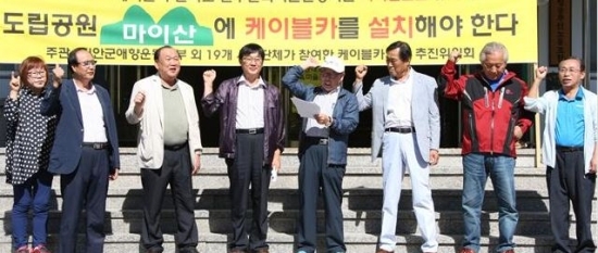 진안군애향운동본부를 비롯한 20개 사회단체가 지난 18일 진안군청 광장에서 마이산케이블카찬성추진위원회(위원장 원봉진)를 구성하고 케이블카 설치에 적극 나섰다.