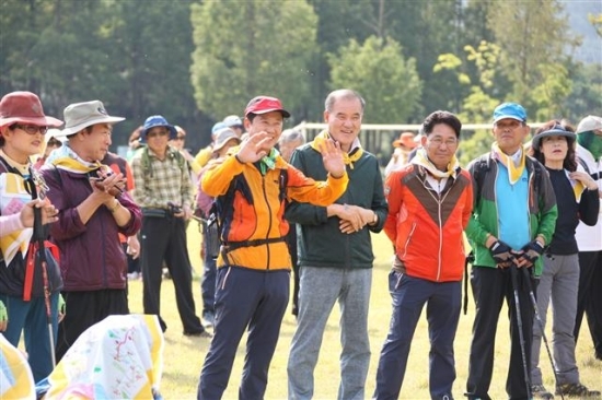 ▲ 진안고원 주천면 생태공원에서 열린 ‘아름다운 진안고원길 걷기’행사에서 이항로 군수 등이 기념촬영을 하고있다.