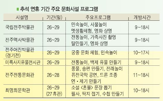황금빛 들녘과 함께 찾아온 민족의 명절. 온가족이 정성껏 마련한 또는 구입한 음식으로 조상에게 ‘신고’를 마쳤다면 본격적으로 연휴를 즐길 차례다. 도내 박물관과 문화시설을 중심으로 명절 상차림만큼 풍성한 프로그램이 마련된다. 가족단위의 관광객이 전통놀이를 즐기며 추억을 만들고, 각종 공연과 전시로 문화적 소양을 곁들이는 휴일을 만들어보자.