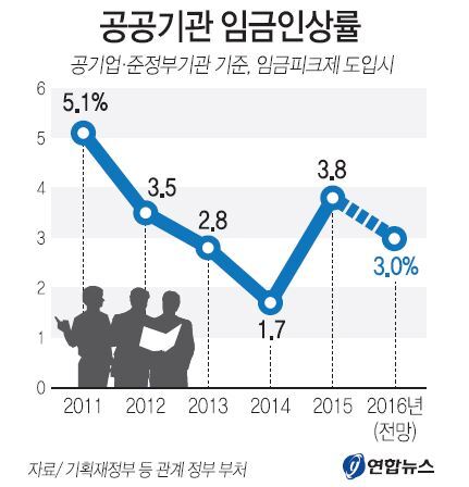 공공기관의 내년 임금인상률은 올해의 3.8%보다는 낮다. 공공기관 임금은 2012년 3.5%, 2013년 2.8%, 2014년 1.7%로 매년 상승폭이 둔화하다가 올해는 2011년(5.1%) 이후 4년 만에 가장 큰 폭으로 올랐다. 경제 상황이 크게 좋아지지 않았는데도 정부가 올해 공무원과 공공기관 임금인상률을 3.8%로 결정했던 것은 민간기업의 임금 인상을 독려해 가계 소득과 소비 여력이 늘어나는 효과를 기대했기 때문이다. 공공부문의 임금인상률은 민간기업 임금 협상에서 중요한 잣대가 된다. 연합뉴스
