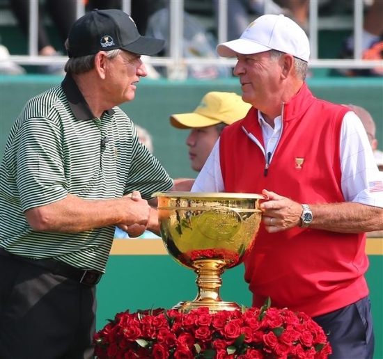 남아프리카공화국, 호주, 일본, 인도 등 7개 국가 선수로 이뤄진 인터내셔널팀은 8일 인천 송도의 잭 니클라우스 골프장(파72·7380야드)에서 열린 대회 첫날 포섬 5경기에서 남아공 듀오 루이 우스트히즌-브랜던 그레이스조만 승리했을 뿐 나머지 경기에서 미국팀에 완패했다.